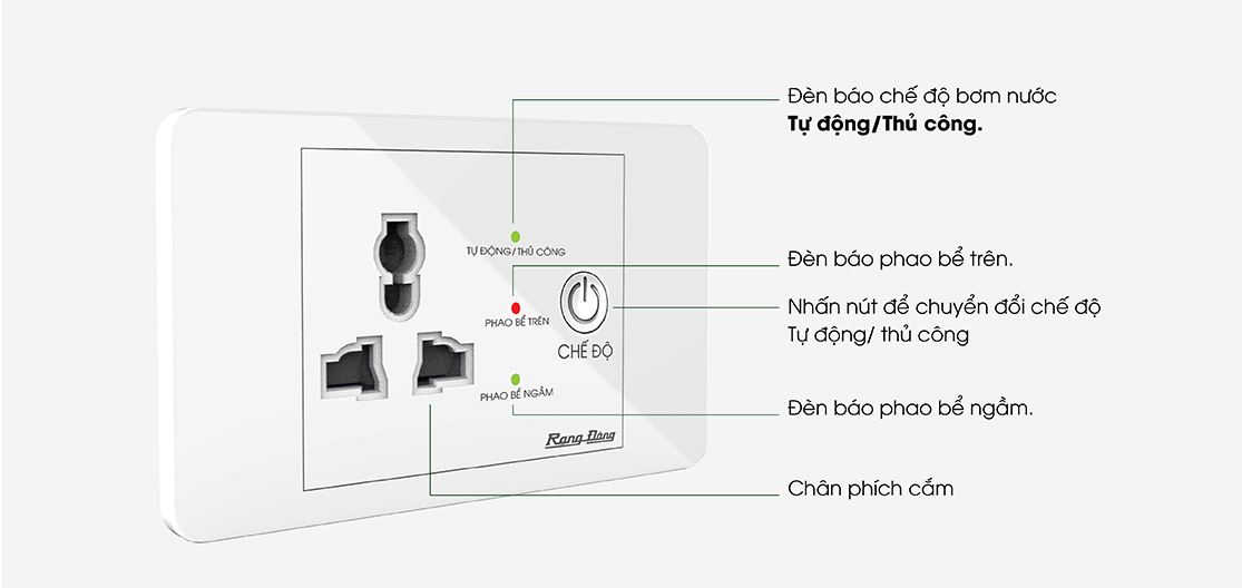 Ổ cắm tự động ngắt nguồn khi bể cạn nước hoặc không có nước, tiết kiệm điện năng. Và tiếp điểm phao điện không phải chịu tải đóng cắt nguồn điện trực tiếp 220V đến máy bơm, gia tăng tuổi thọ thiết bị.