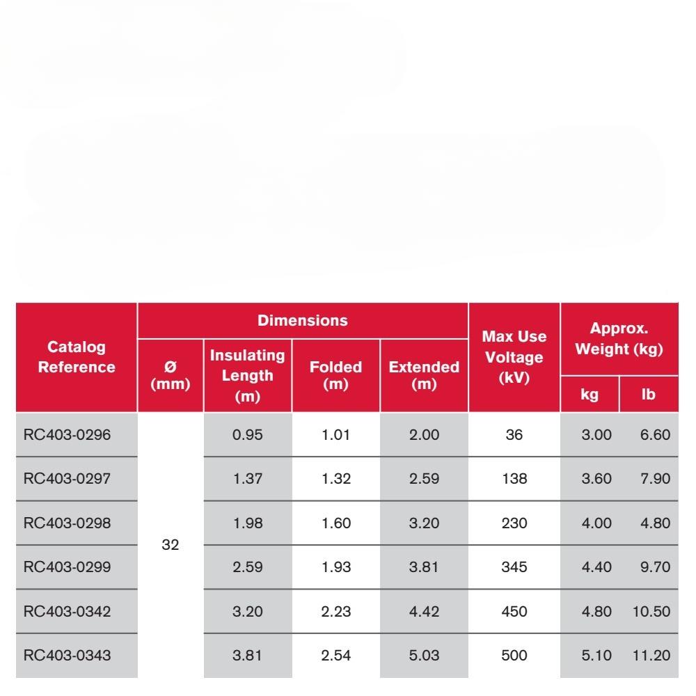 - Sào Tiếp Địa 1 Đoạn Terex Ritz RC403-0293 (112kV) nó có một cơ chế bao gồm một móc gấp và có thể thu vào ở cuối, được vận hành bằng một tay cầm có thể điều chỉnh ở vùng tay cầm của nó ở ba vị trí làm việc cơ bản thông qua một giá đỡ và hai khóa an toàn, khiến nó trở thành một công cụ đa năng thiết thực.