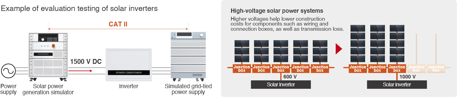 Trong số đó, Hioki PW8001, kết hợp với Unit đầu vào U7001, có khả năng chính xác đo lường điện áp đầu vào cao tới 1500 V DC dưới chuẩn CAT II và 1000 V DC dưới chuẩn CAT III một cách trực tiếp. Dây điện áp L1025, tương thích với cả 1500 V DC (CAT II) và 1000 V DC (CAT III), cũng được cung cấp để hỗ trợ quá trình này.