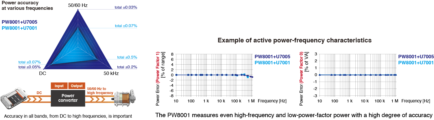 PW8001 mang lại độ chính xác cao trong việc đo lường, không chỉ ở dải tần 50/60 Hz mà còn mở rộng đến toàn bộ dải, bao gồm DC và 50 kHz. Nhờ đó, nó hỗ trợ việc đánh giá chính xác về hiệu suất chuyển đổi năng lượng, một quá trình thường yêu cầu việc đo kiểm ở nhiều tần số khác nhau.