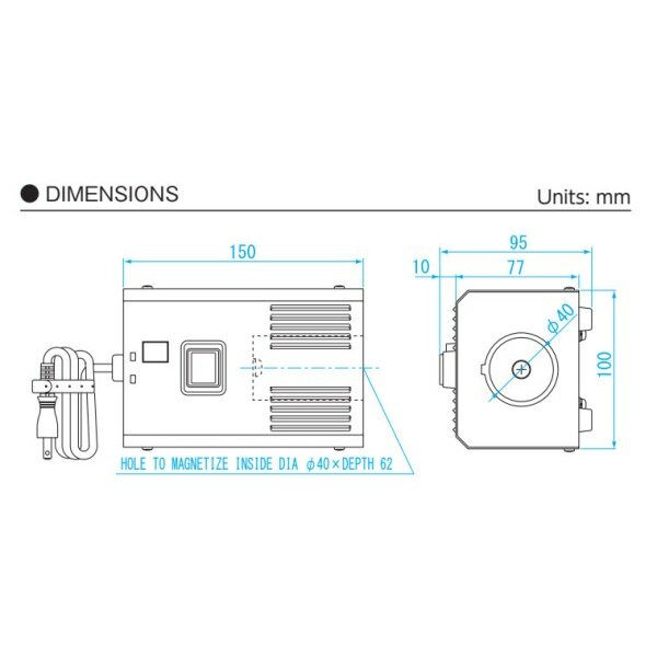 Sản phẩm được thiết kế nhỏ gọn, với kích thước chỉ 150x100x95mm và trọng lượng 1.4kg, rất tiện dụng trong việc di chuyển và lắp đặt. Công suất hoạt động của thiết bị đạt 275W, đáp ứng tốt các yêu cầu kỹ thuật đa dạng. Buồng từ với kích thước ɸ40x62mm được tối ưu để tạo lực từ 0.17N, đảm bảo hoạt động ổn định và hiệu quả.