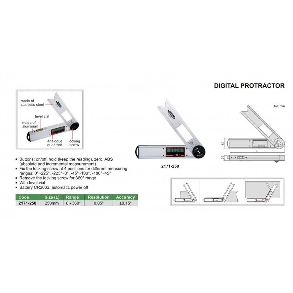 Thông Số Kỹ Thuật của thước đo góc điện tử Insize 2171-250