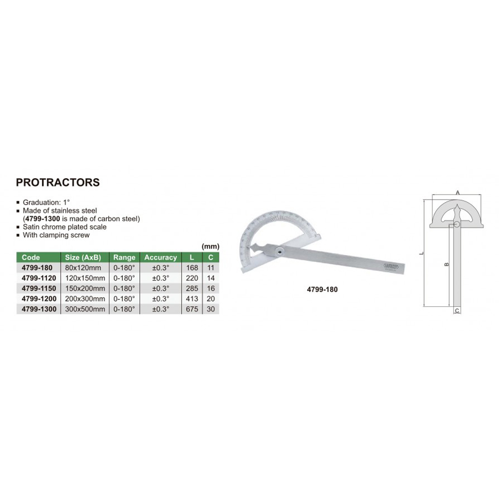 - Thang đo góc có độ chia 1 độ, khoảng đo từ 0 -180 độ, độ chính xác là ± 0.3 độ, sẽ giúp đánh dấu góc độ cho tấm thép, tấm gỗ để gia công tối ưu.