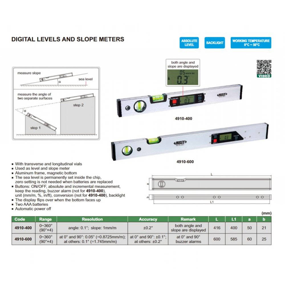 | 4910-400 | 0 – 360° (90°x4) | Góc: 0.1°; Độ dốc: 0.11mm/m | ±0.2° | Cả góc và độ dốc đều được hiển thị | 416 | 400 | 50 | 21 |