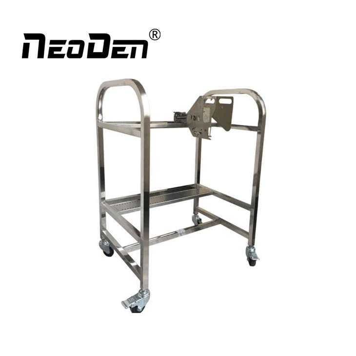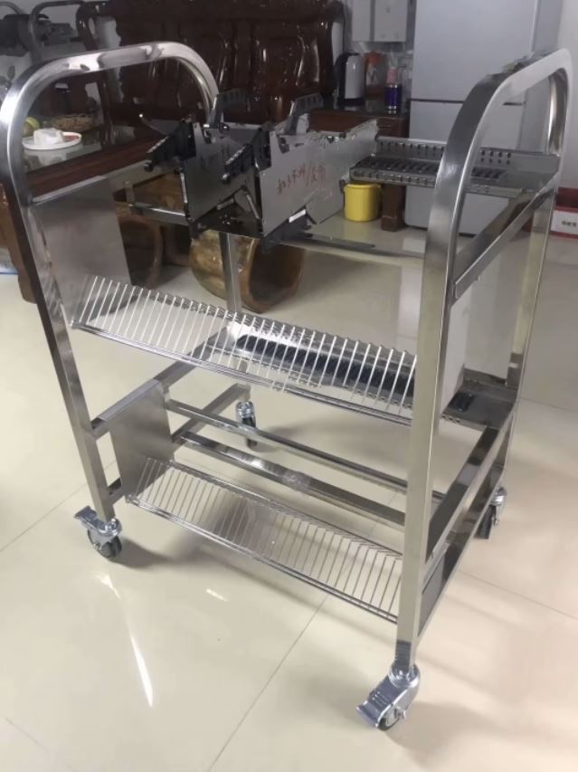 3. Khi đến lúc chuyển sang công việc tiếp theo, xe đẩy sẽ được di chuyển đến hệ thống đặt đúng vị trí, các bộ cấp liệu hiện có trên bộ lắp ráp sẽ được chuyển đến một kệ chưa sử dụng trên xe đẩy và bộ cấp liệu “được lắp sẵn” sẽ di chuyển từ các khe được đánh số trên xe đẩy vào cùng một khe số trên máy.
